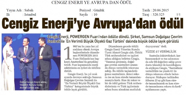 Cengiz Enerji’ye Avrupa’dan Ödül